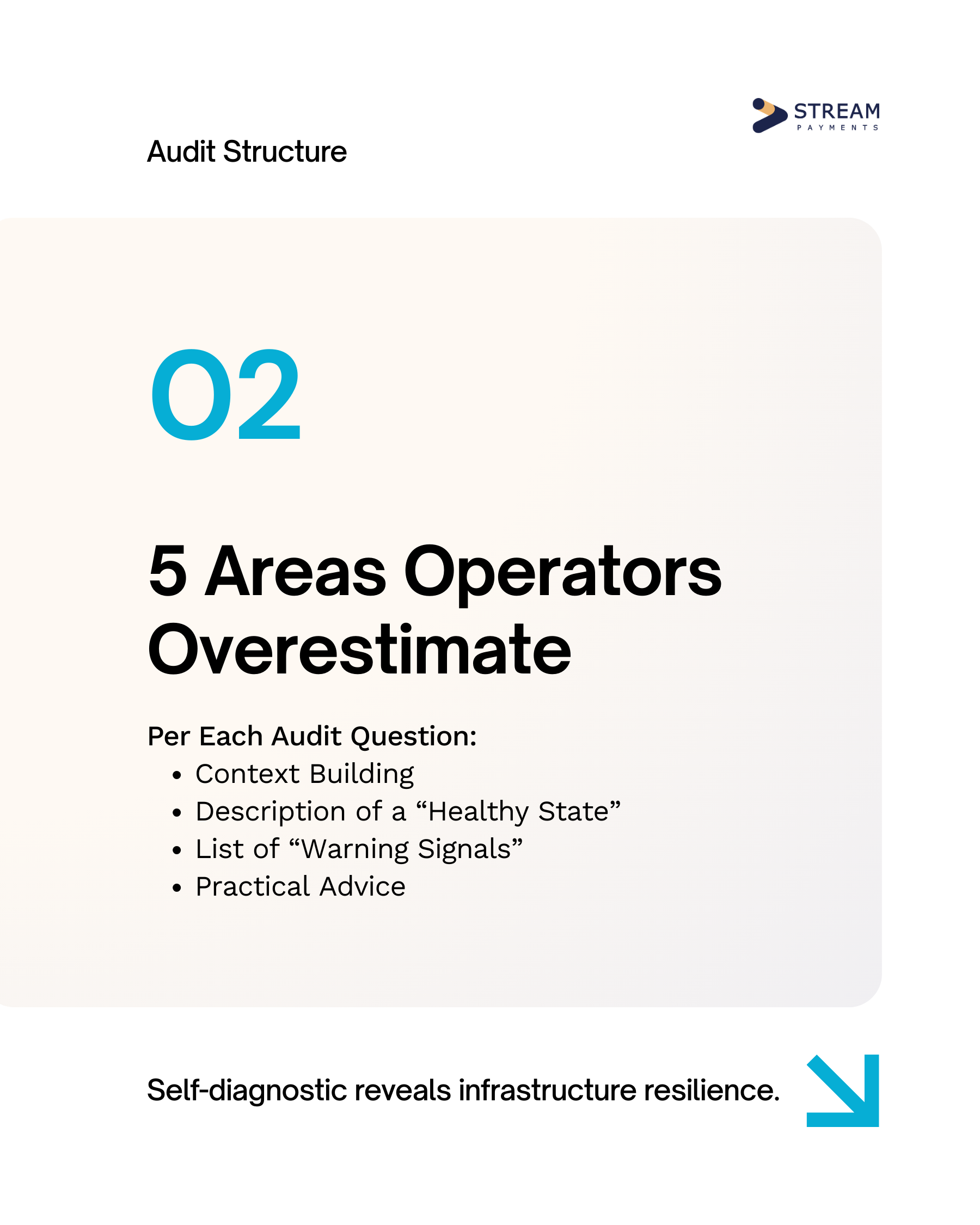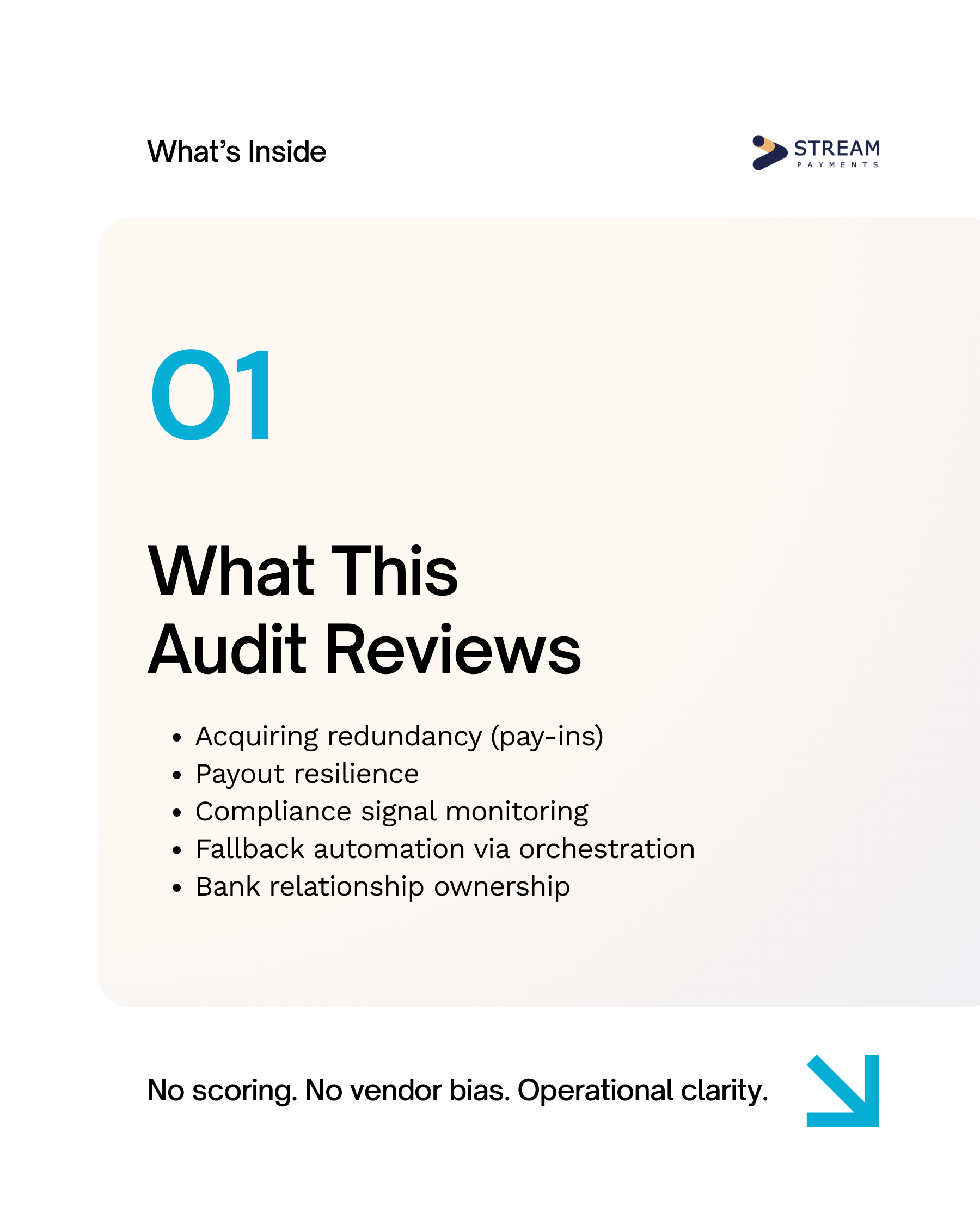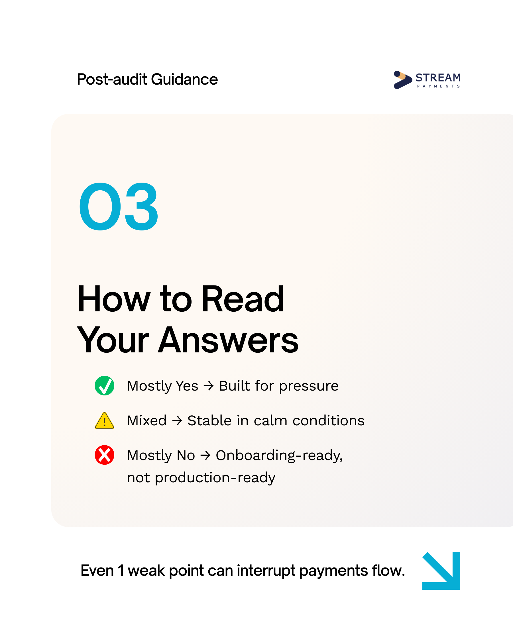 The audit is not designed as a marketing asset, nor as a scoring mechanism. It is an operational review intended to help teams assess whether their acquiring structure, payout resilience, monitoring depth, fallback automation, and partnership governance are genuinely production-ready.