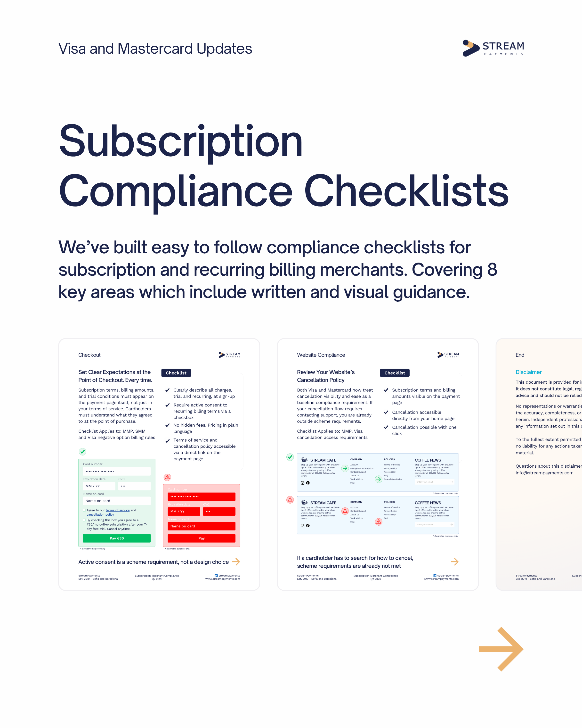 A practical compliance reference for subscription and recurring billing merchants navigating current and upcoming card scheme requirements from Visa and Mastercard.